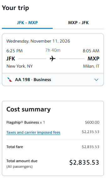 Screenshot of sample fare on aa.com: