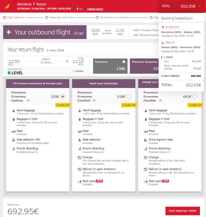 Screenshot of sample fare on iberia.com: