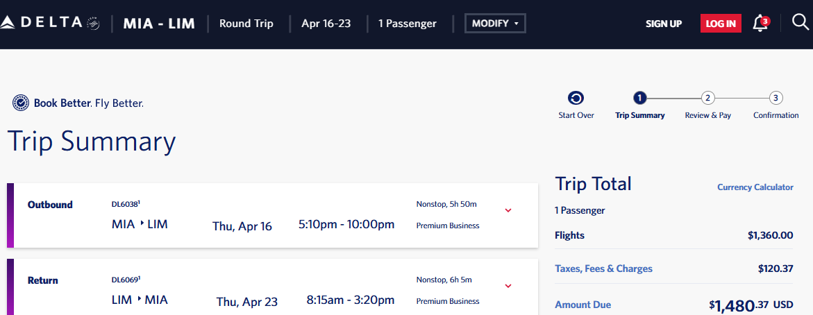 Screenshot of sample fare on delta.com: