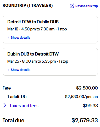 Sample Savings: Detroit to Dublin goes for $2,679 round-trip. Compared to regular published fares of about $3,200 to $5,000.