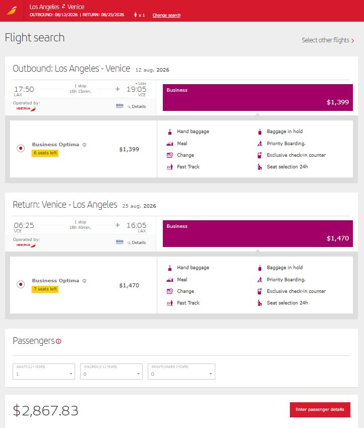 Sample Savings: Los Angeles to Venice goes for $2,867 round-trip. Compared to the regular published fares of about $3,200 to $5,000.