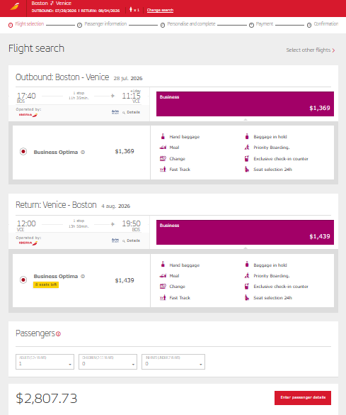 Screenshot of sample fare on iberia.com: