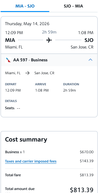 Screenshot of sample fare on americanairlines.com: