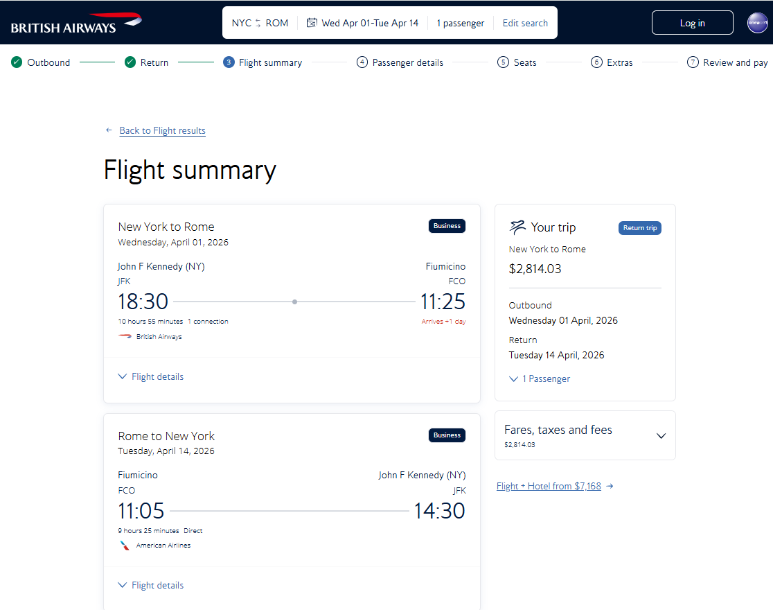 Screenshot of sample fare on britishairways.com: