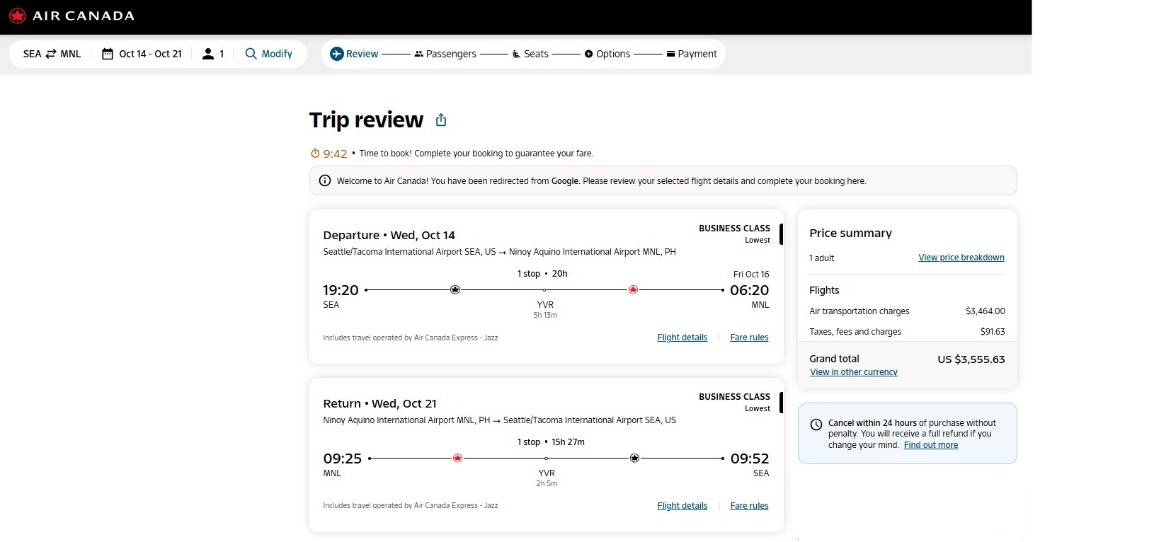 Screenshot of sample fare on aircanada.com: