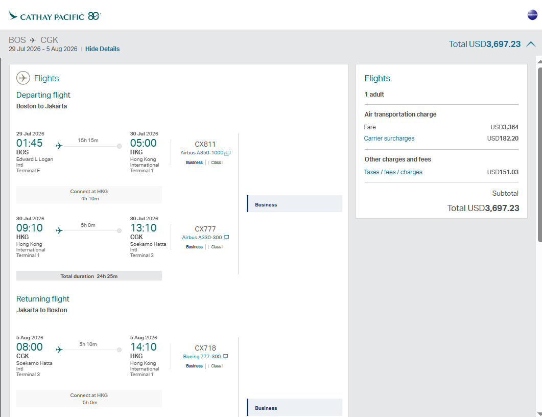 Screenshot of sample fare on cathaypacific.com: