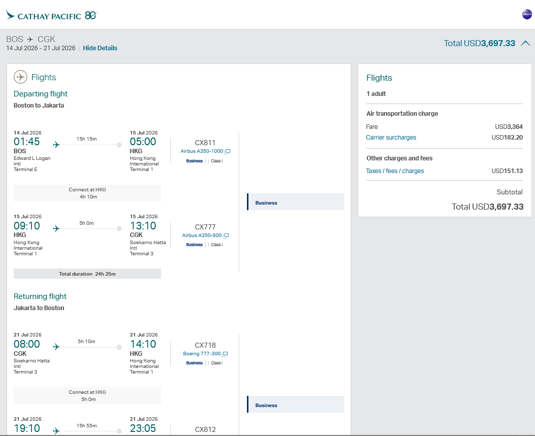 Sample Savings: Boston to Jakarta goes for $3,697 round-trip. Compared to regular published fares of about $4,000 to $5,000.