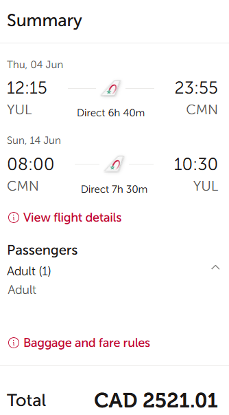 Screenshot of sample fare on royalairmaroc.com: