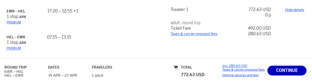 Screenshot of sample fare on flysas.com: