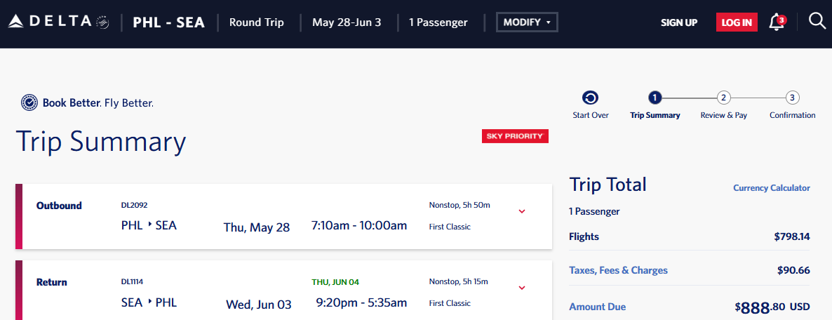 Screenshot of sample fare on delta.com:
