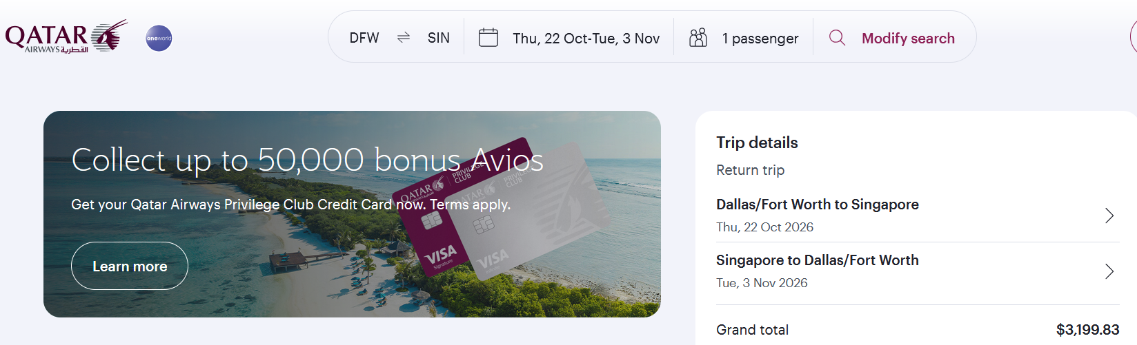 Screenshot of sample fare on qatarairways.com: