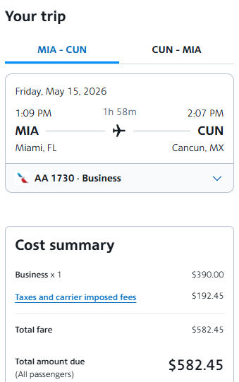 Screenshot of sample fare on aa.com: