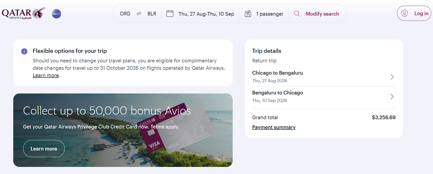 Screenshot of sample fare on qatarairways.com: