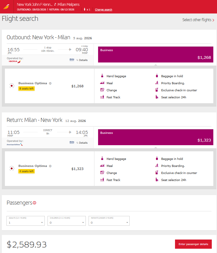 Screenshot of sample fare on iberia.com: