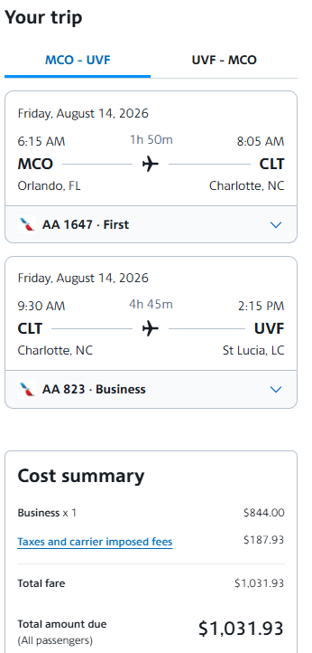 Screenshot of sample fare on aa.com: