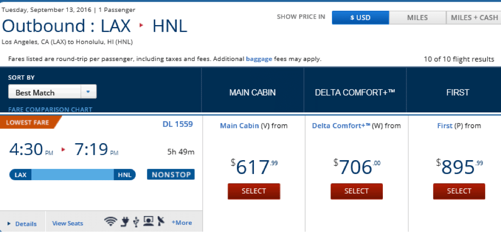 After you figure in all the fees economy class can involve—checked bags, Delta Comfort+, and meals—the difference between First Class fares and economy (i.e. the cost to upgrade) can often drop to only $10 per hour in flight (round-trip flight time LAX-Honolulu is about 11 1/2 hours).