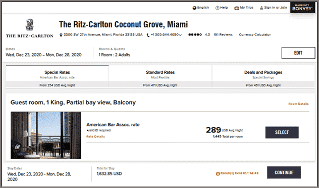 The screenshot below shows prices for the Ritz-Carlton Coconut Grove in Miami. The price per night is $571 BEFORE the ABA discount, and just $289 AFTER the discount is applied for a five-night stay in December over Christmas. It’s for a standard king room with a partial bay view and balcony using the ABA rate code.