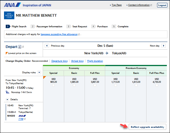- Under each fare type, you will see “YES” if this fare is eligible for an upgrade, along with which cabin you can upgrade to. If “YES,” scroll to mid-page and select “Reflect upgrade availability.” To the left under “Upgrade” you can see if Business Class seats are available for your chosen flight. Do the same for the return flight.