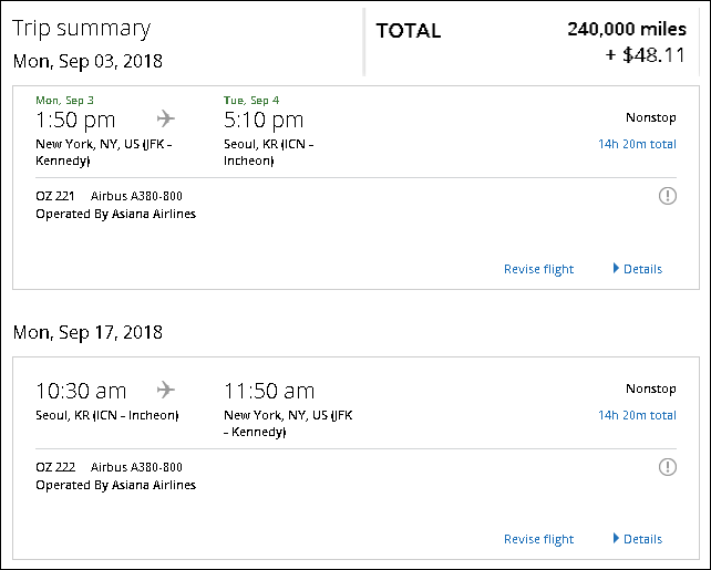 So, the best solution is to book Asiana’s First Class using Asiana miles—which you can get easily. On the New York-Seoul route, United’s lowest First Class partner award costs 240,000 miles and $48 in taxes, whereas Asiana charges 160,000 miles and $266 in taxes.