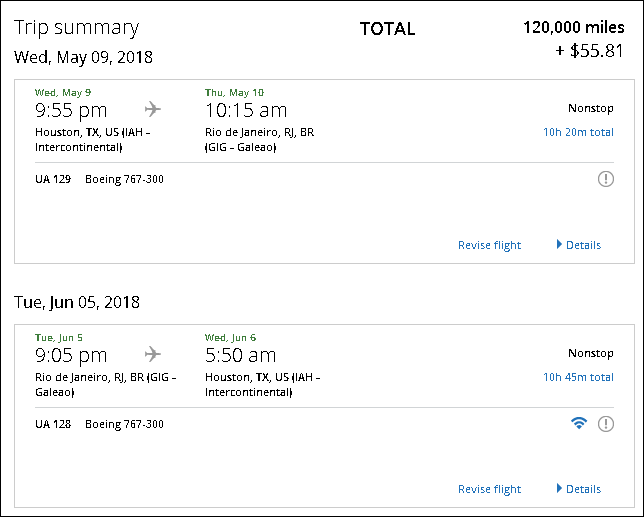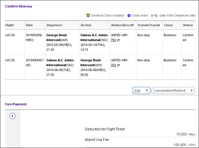 Sample trip to South America saves 50,000 miles (enough for a free First Class ticket in the U.S.): On the Houston-Rio de Janeiro route United’s lowest Business Class award costs 120,000 miles and $56 in taxes, while Asiana charges only 70,000 miles and about $93 in taxes.