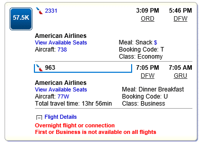 Chicago-São Paulo one-way award Business Class on American connecting in Dallas on AA 963 screenshot below.