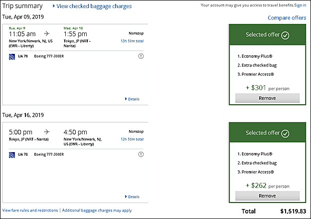 Now, if you fly Economy Plus on United, which is economy with a bit of extra legroom, then the upgrade to a Premium Economy seat is free on the Newark to Tokyo route. The screenshot below shows Economy Plus on United priced at $1,520. Please note that Economy Plus is only available as a bundle offer and it also includes an extra checked bag and Premier Access (dedicated airport check-in lines, exclusive security lanes at select airports, and priority boarding).