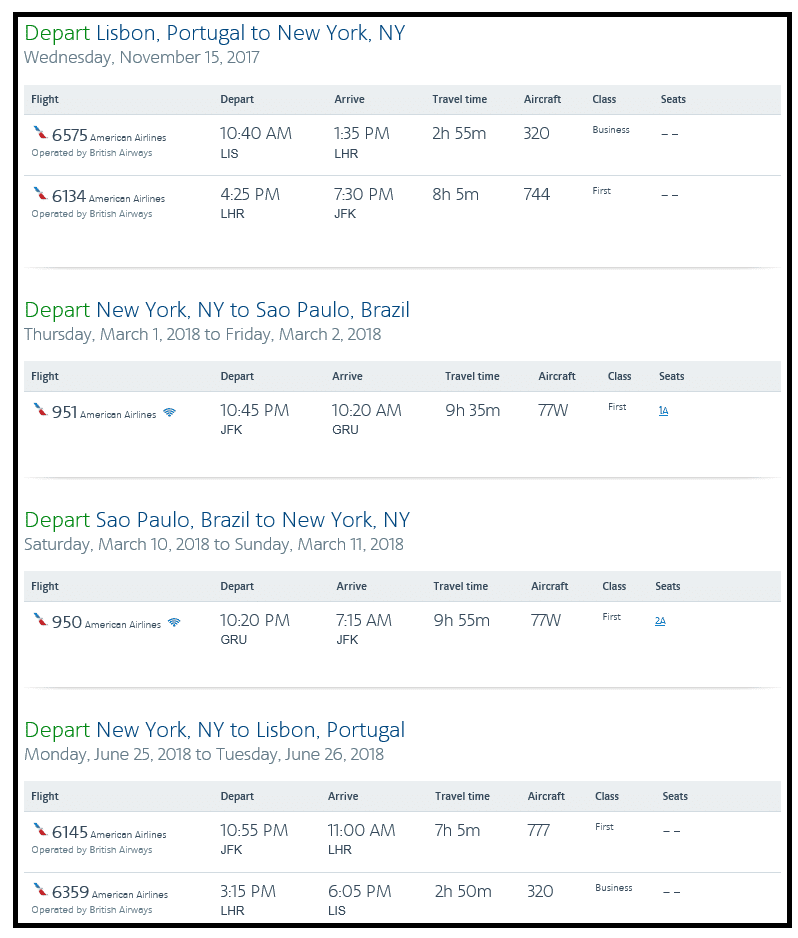 In the map and flight itinerary below, we show a leg-stretch between Lisbon, New York, and São Paulo in First Class starting at $4,261.32; but the strategy also works from other cities on American and British Airways, including Buenos Aires, Atlanta, Boston, Miami, and Washington, DC.