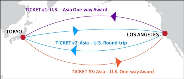 This is where you bookend the cost-effective Asia>U.S.>Asia flight with two mileage award or low-fare one-way flights at either end. Check out the diagram below for clarity.