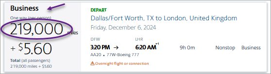 - Dallas to London nonstop in Business Class on American costs 219,000 miles