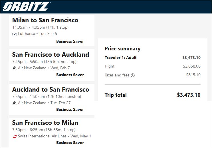Let’s compare this to a Business Class trip with flights to Milan and Auckland bought as two separate round-trip tickets. In Business Class, it would cost around $12,599 at the time of publication. Again, combining them into one Leg Stretch Business Class ticket costs $3,473. That’s a savings of $9,126, or 72%.