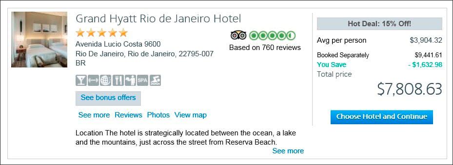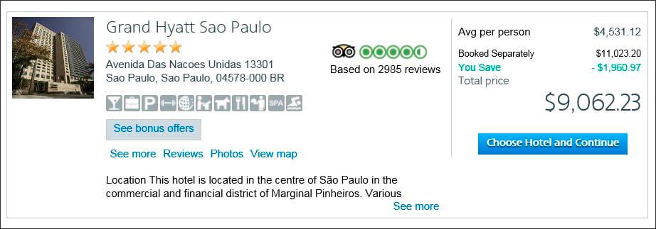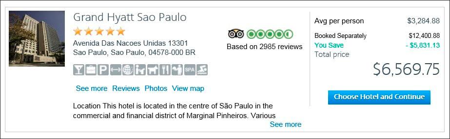 Example: Los Angeles-Sao Paulo: A seven-night package costs $3,285 per person (based on two travelers). That includes seven nights’ accommodation at the Grand Hyatt Sao Paulo. Booking the flight and hotel separately would cost $12,307, or $6,153 per person—$1,150 for the hotel and $ 11,157 for the two tickets. The package saves you $5,737 (47%).