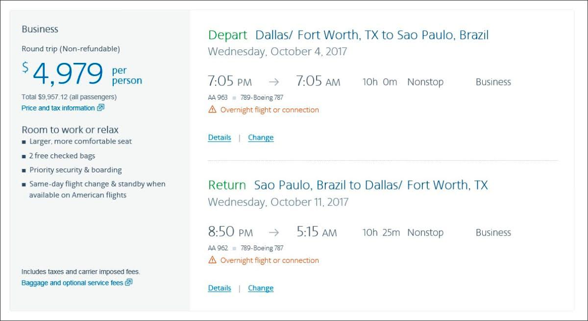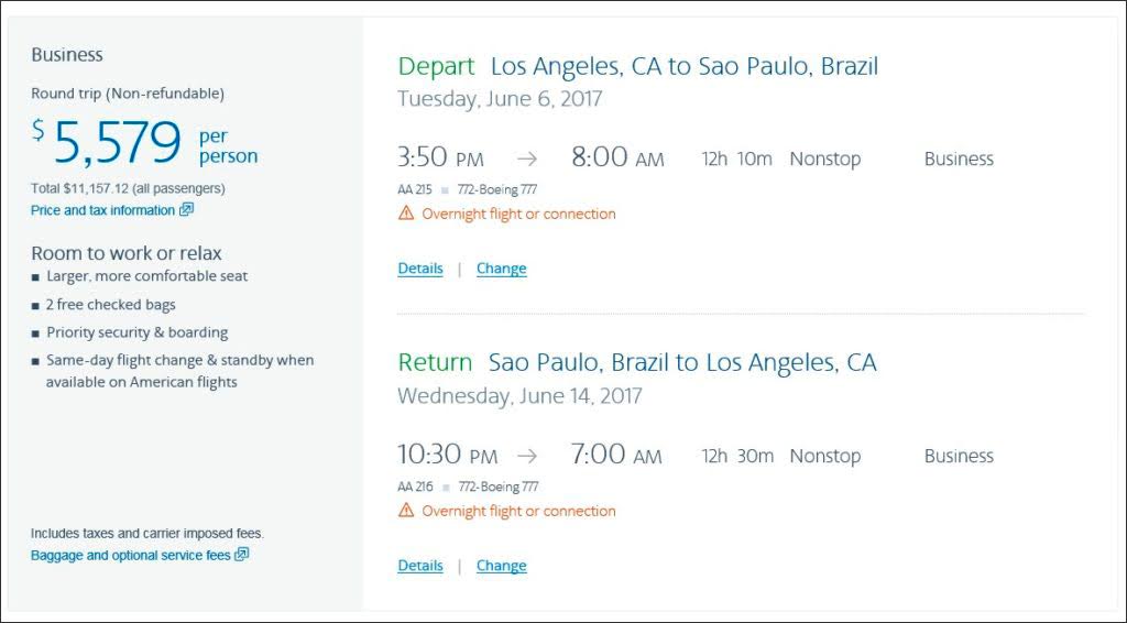 Example: New York-Rio de Janeiro: The lowest advance-purchase Business Class ticket costs $ 4,179. But the AA Vacations package is $3,904 (based on two flying together) and includes seven nights at the Grand Hyatt Rio.