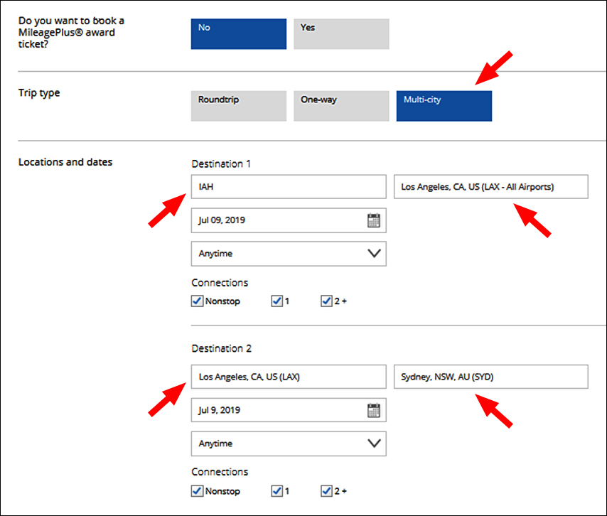 Step 3: Add the domestic connecting flight. Without losing the upgrade space for the long-haul on one ticket, you’ll need to search for the upgrade by using United’s multi-city search. This is really important to enable United’s computer system to view each flight segment separately, rather than as a whole.