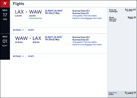 Samples of Business Class Fares Found to Warsaw