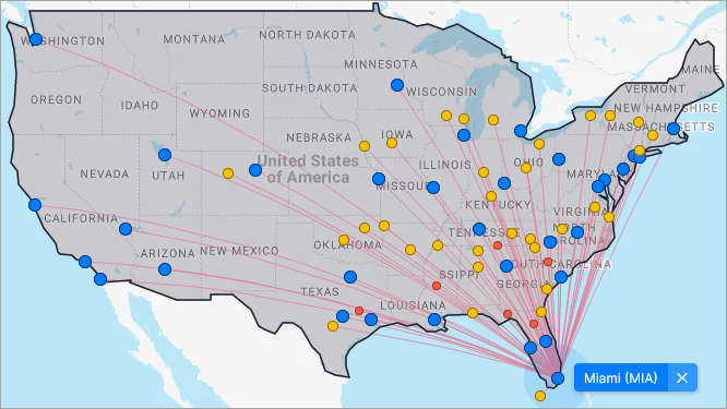 American Airlines Routes to/from Miami Screenshot from FlightConnections.com