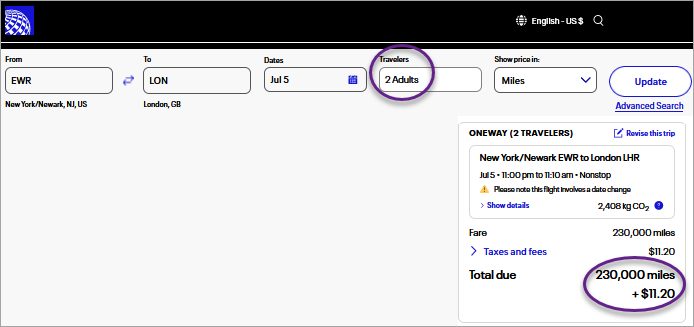 We then searched for two seats, on the same day, and United offered the same flight for 230,000 miles (115,000 miles each).