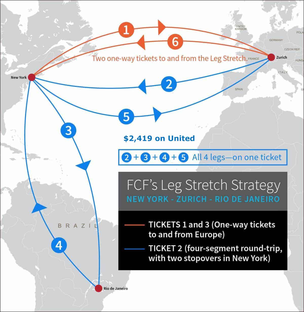 Sample Math: A New York-Zurich non-stop ticket in economy typically ranges from ~$600 to $1,100 round-trip and New York-Rio de Janeiro in economy ranges from ~$1,300 to $1,800 on Delta/United. That’s $1,900 minimum to fly economy—and possibly $2,900 depending on your dates—while the Leg Stretch nets those same destinations in Business Class for as little as $2,419.