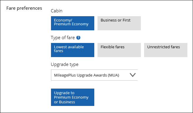- Select the “Buy Economy and upgrade” option to search for upgrade space to Business Class from economy in the “Fare preferences” section, after you click on “Upgrade type.” See below: